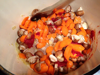 Add the garlic and cook for 1 more minute, then add in the mushrooms. Once the mushrooms are in you can add in the tomato paste, mix to combine the paste.