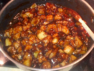 Ingredients -12 cups eggplant, peeled, cut into 1-inch dice (1 large & 1 medium eggplant) -Oil, for frying