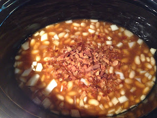 Transfer the beans to your slow cooker or a bean pot and add onions on top.